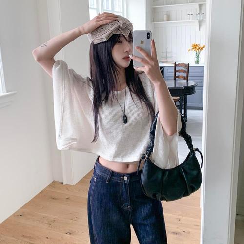 하계 여친 니트 가오리핏 반팔 상의 여 브이넥 셔츠 슬림핏 티 KS2