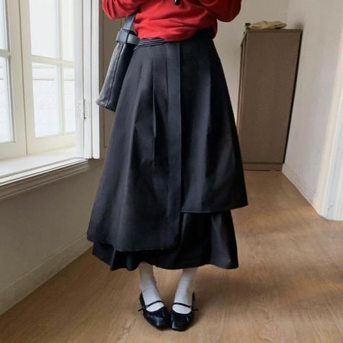 [옷자락] 여자 봄가을 사계절 데일리 코튼 레이어드 플레어 롱스커트