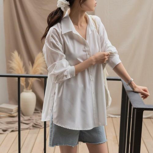 [옷자락]여성 봄가을 긴팔 하이넥 트임 슬림 티