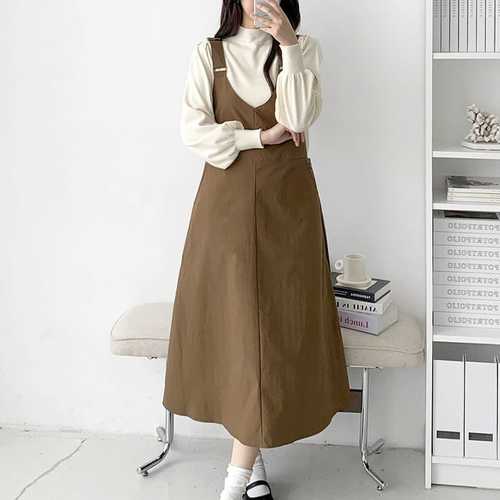 옷자락 / 여자 브이 멜빵 절개 A라인 가을 데이트룩 롱원피스
