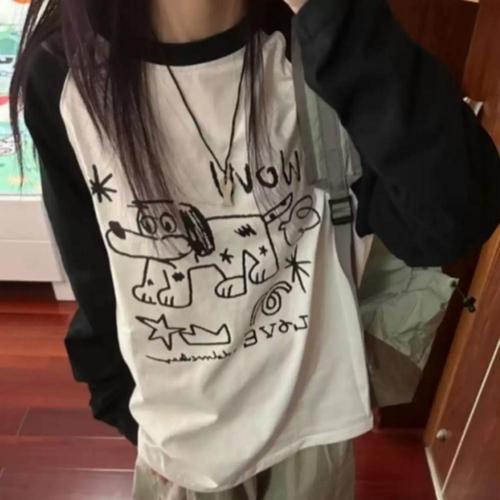 [에이치플러스몰]강아지 프린트 긴팔 배색 티셔츠 가을 오버핏 커플