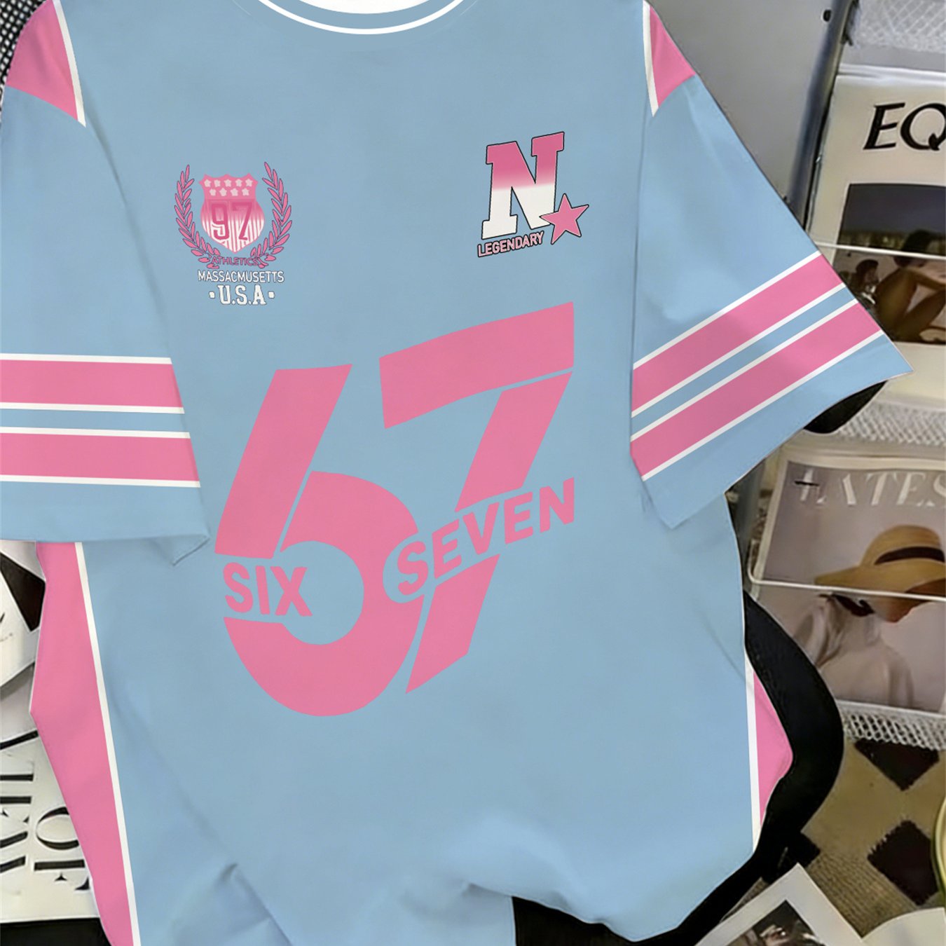 TEMU 아동용 "67" 넘버 저지 티셔츠 패션 O넥 패치워크 반팔 상의 여름 남아용 초시원한 심플 편안한 스트리트웨어