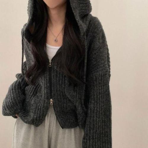 [옷자락]여성 겨울 일상 루즈핏 케이블 후드 니트 집업 가디건