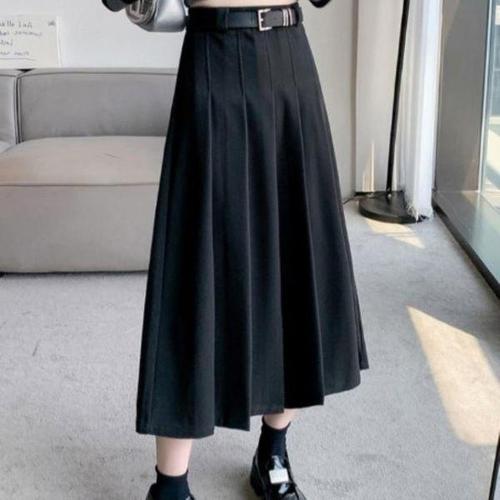 네모엔룩 롱핀턱플리츠 여성용 허리핀턱 주름A라인 벨트세트 롱 스커트. 스커트+벨트 총 2종