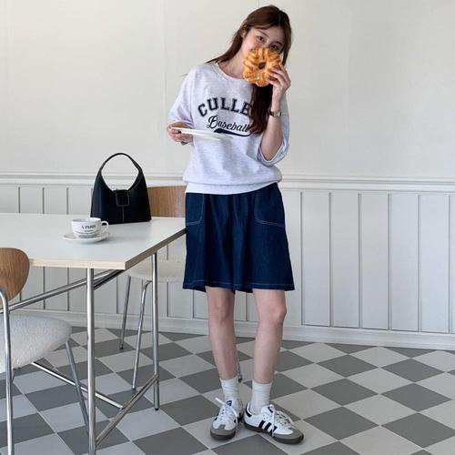 [다잇템]여자 버뮤다 고무줄 자수 클래식 여자 데님팬츠
