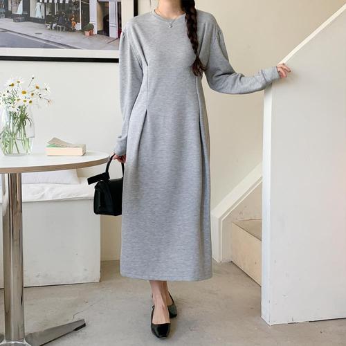 [옷자락] 여자 라운드넥 어깨 퍼프 핀턱 골지 롱 원피스