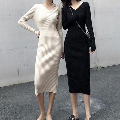 라라홀리 브이넥 슬림 라인 골지 롱 니트 원피스