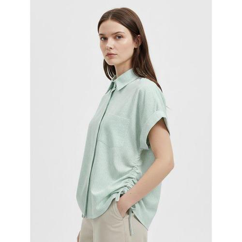 [샵앤]여성 카라넥 스트라이프 옆셔링 반팔 블라우스 셔츠 NARU-WBL-21136-그린