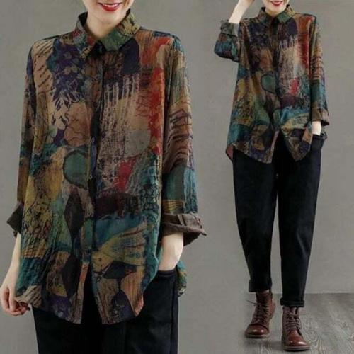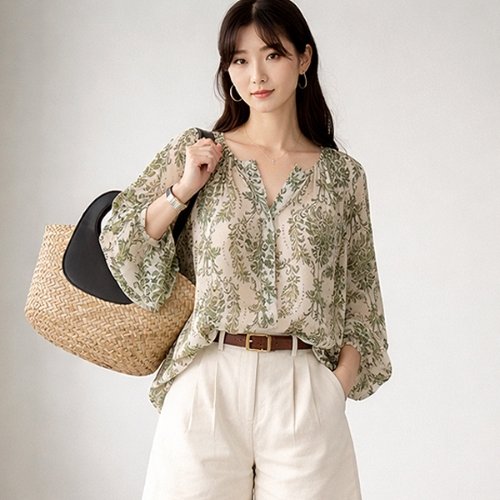 [셀럽하우스]그린 RFKQ2458 꽃패턴 루즈핏 블라우스 20대 여대생 상큼한 룩