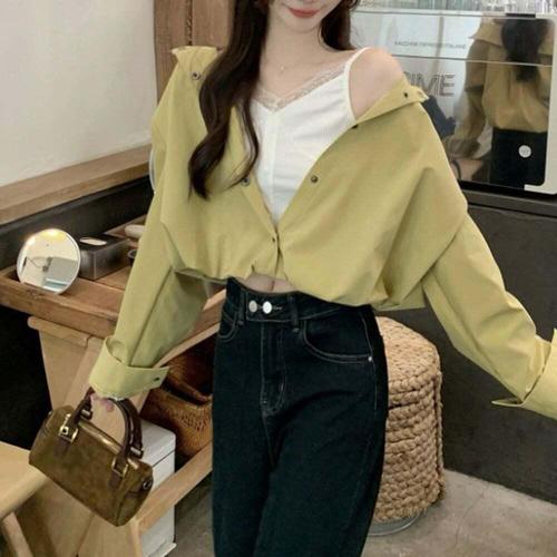 [셀럽하우스]레이스 NJHP0387 사니 여성 셔츠 일체형 세트 옐로우그린