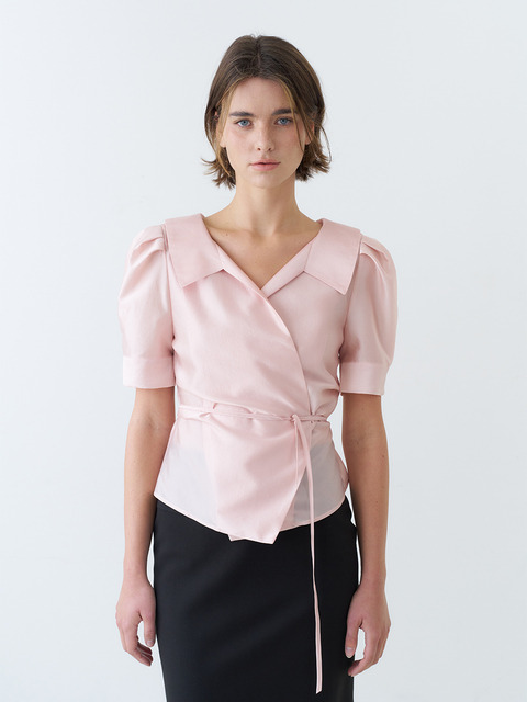 [벰버] 퍼프 슬리브 글로시 칼라 랩 블라우스_핑크