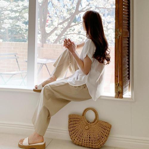 [옷자락]여성 기본 데일리 루즈핏 면 카라 롤업 반팔 셔츠 블라우스