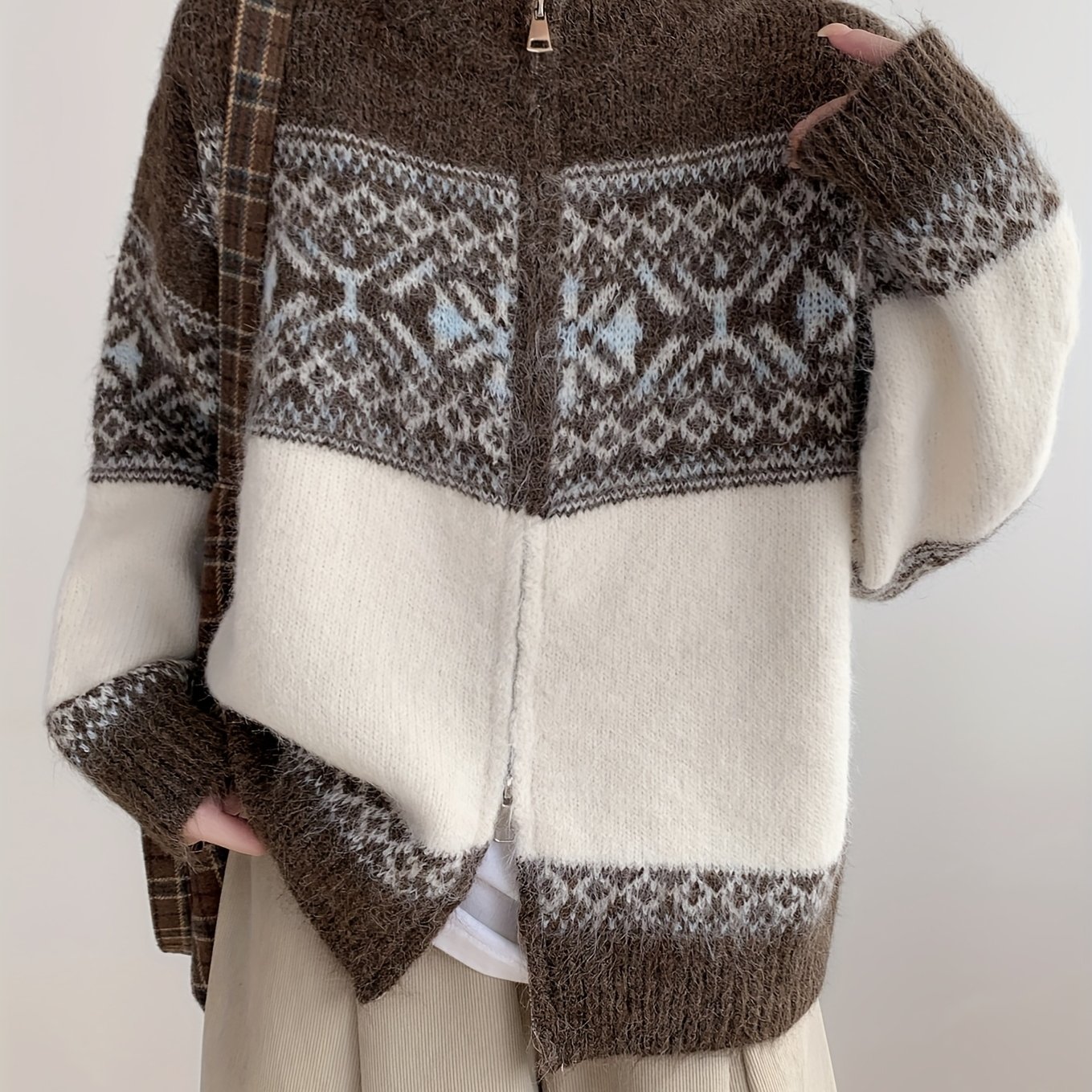 TEMU 가을 겨울 일본 한국 스타일 우아한 캐주얼 데일리 출퇴근 파티 라운드넥 이중 레이어 트리밍 칼라 따뜻한 대비 fair isle 자카드 기하학 패턴 이중 지퍼 편리한 온 오프 오프숄더 슬리브 긴팔 부드러운 논스틱 스킨 여성용