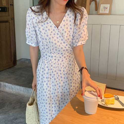 슈팅스타 / V넥 꽃무늬 허리 슬림 A라인 퍼프소매 원피스 930349