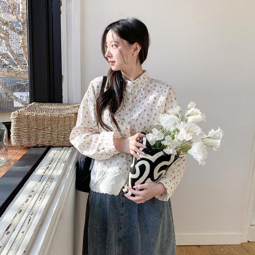 HIN 로맨틱 쉬폰 잔꽃 블라우스 롱슬리브 셔츠