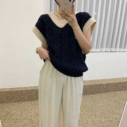 여성 꽈배기 배색 V넥 니트 조끼 베스트 레이어드