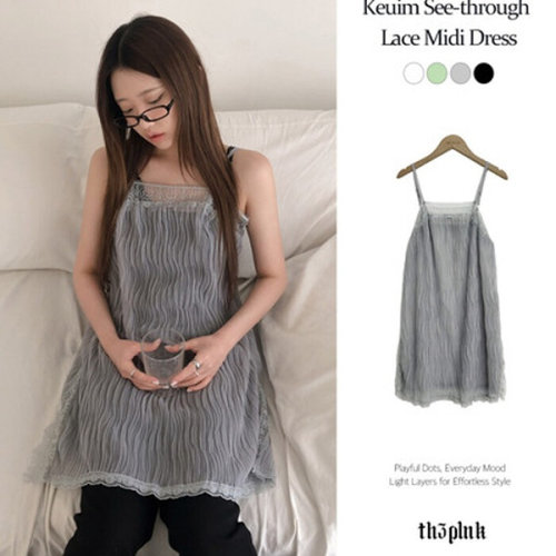더핑크 / 크임 시스루 레이스 옆트임 끈나시 미디 원피스
