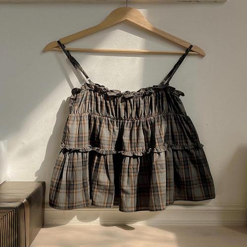 [엘루이즈][엘루이즈] [모리걸/끈조절] 쥬로아 체크 티어드 셔링 프릴 나시 블라우스(2color)