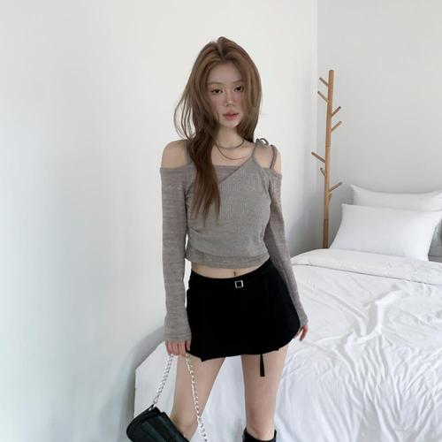 [파라노말샵]3색 셔링 끈 오프숄더 슬림 긴팔 크롭티 (파라노말샵)