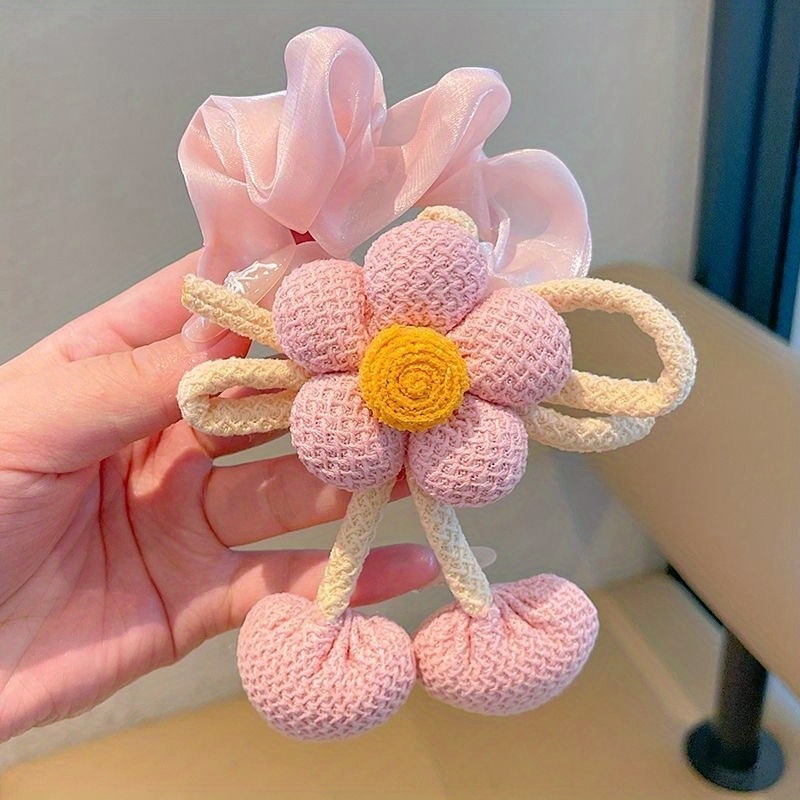 TEMU 니트 플라워 헤어 타이, 번메이커, 큰 장발용 헤어 루프, 술 장식 리본, 헤어 액세서리