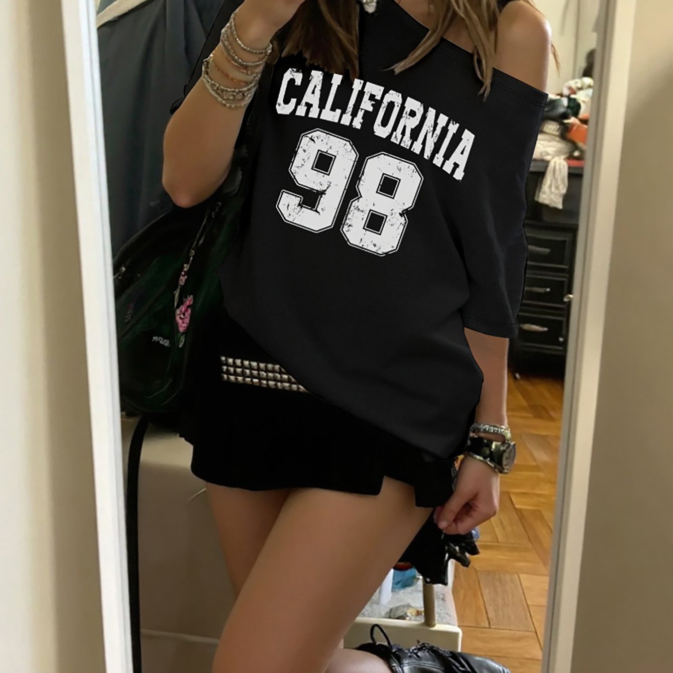 TEMU 캘리포니아 번호 98 영어 레터 프린트 원숄더 아сим메트리 칼라 Y2K 여성 티셔츠