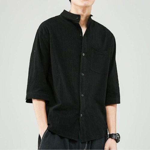 코튼 린넨 셔츠 남성 헨리 넥 포켓 캐주얼 비치 반소매 솔리드 컬러 남성 탑 티셔츠 빈티지 streetwear