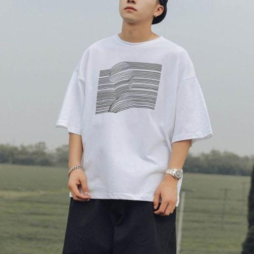 1+1 남성 오버핏 라운드 반팔티셔츠 베이직 빅사이즈 프린트 5부소매 반팔티 데일리룩
