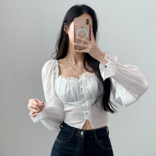 [에이치플러스몰]여성 레이스 밴딩 셔링 스퀘어넥 긴팔 크롭 블라우스