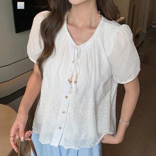 COSYEVNO 여성 여름 레이스 리본 프릴 반팔 블라우스 BCXpp-10