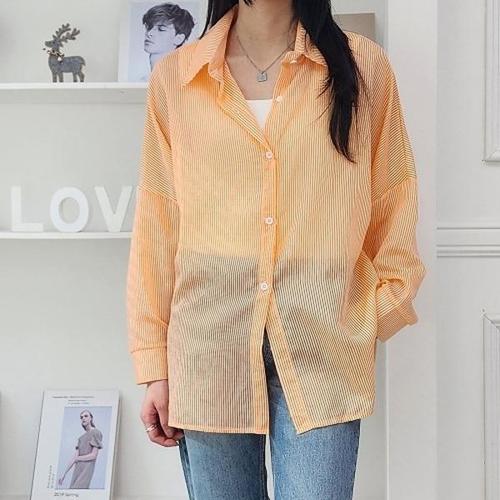 옷자락 / 여자 파스텔 여리핏 노란색남방 세미시스루 면 셔츠