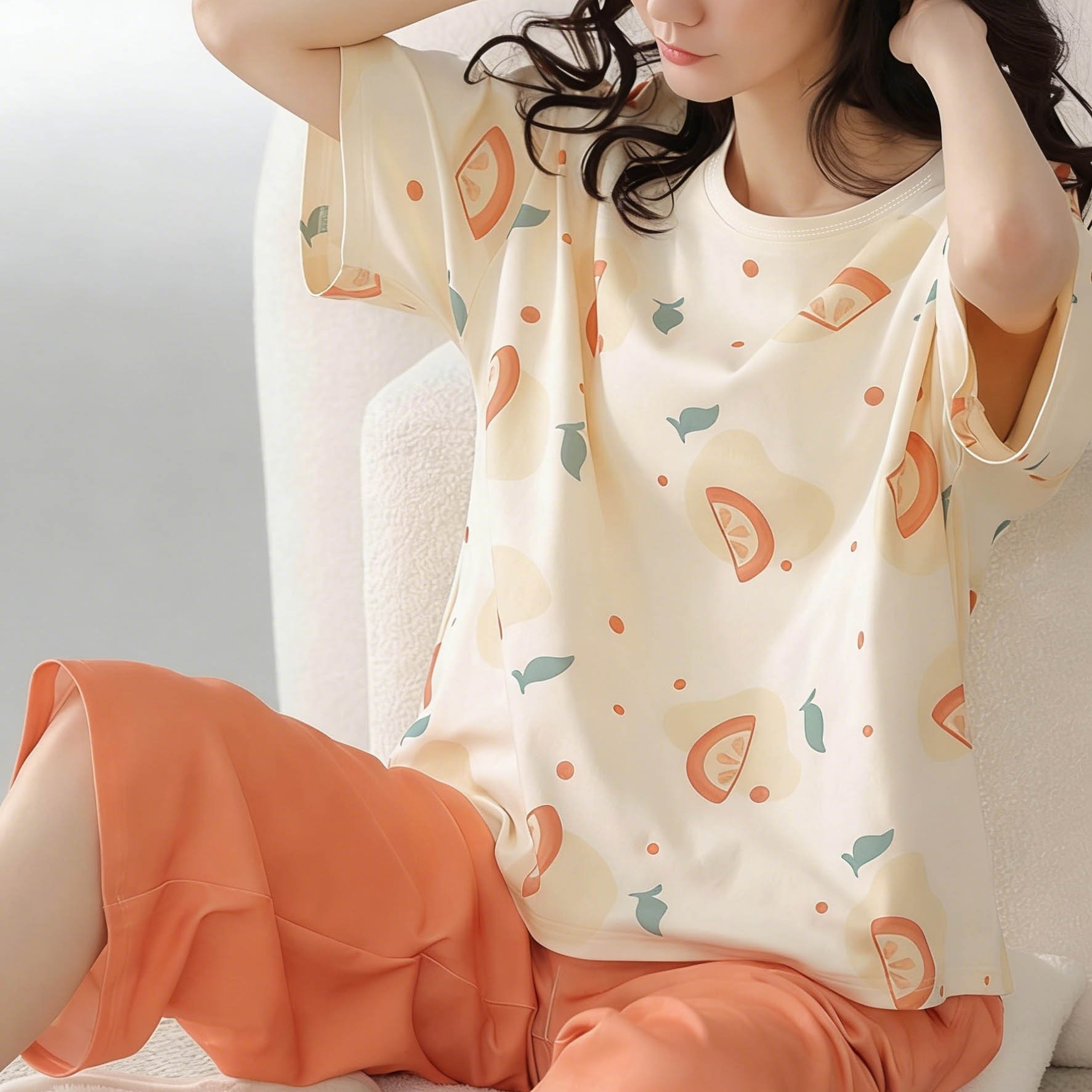 TEMU 반팔 카프리 잠옷 세트, 여성용 캐주얼 루즈핏 편안한 만화 프린트 홈웨어 세트