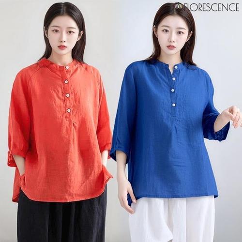 [셀럽하우스]린넨 UCZZ4347 소재 클래식 스타일 노카라 넥라인 셔츠 남방