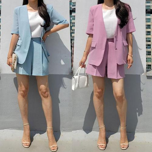[바이어스]노카라 반팔 자켓 반바지 셋업 투피스 벨트 세트 코디 (15149654A)
