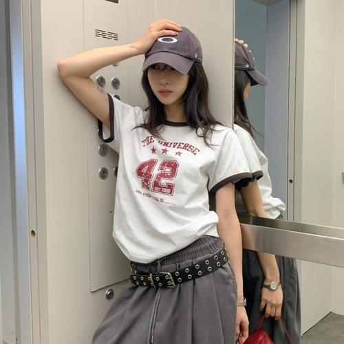 [셀럽하우스]여성티셔츠 UNJI6741 뉴트로 오퍼핏 스타일 반팔 티셔츠