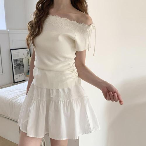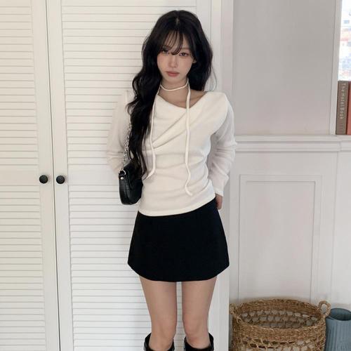 [옷자락] 여자 원숄더 언발커팅 셔링 스트링 슬림핏 니트 티셔츠