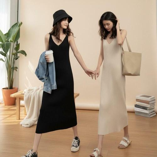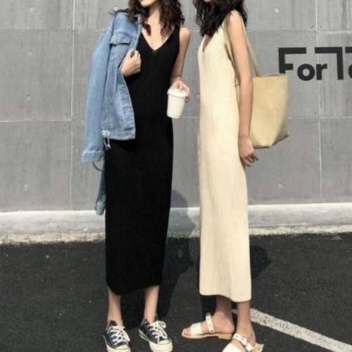 [옷자락]여성 2색 니트 슬림 롱 민소매 원피스