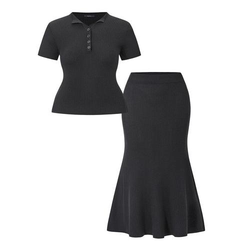 [GGPX]오픈 카라 반버튼 반팔 롱 스커트 니트 셋업 (GQBOW021D)