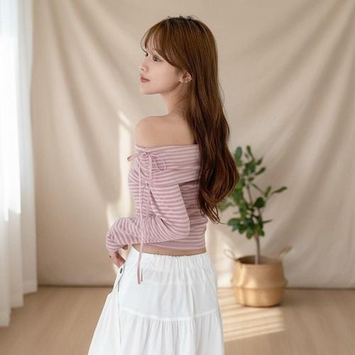 [옷자락]여성 슬림핏 스트레치 오프숄더 긴팔티 단가라