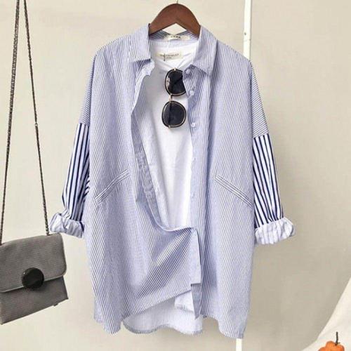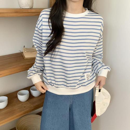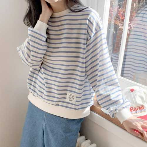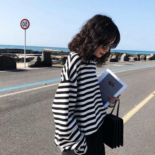 [셀러허브_여성트랜드패션]여자 스트라이프 봄 대학생 배색 박시 맨투맨