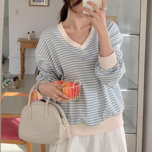 데일리앤 파인드 여성 루즈핏 배색 스트라이프 면 브이넥 맨투맨 티셔츠 봄 가을