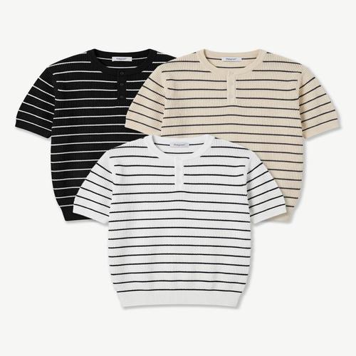 [폴리그램]텍스처 스트라이프 헨리넥 반팔 니트 - 3COLOR