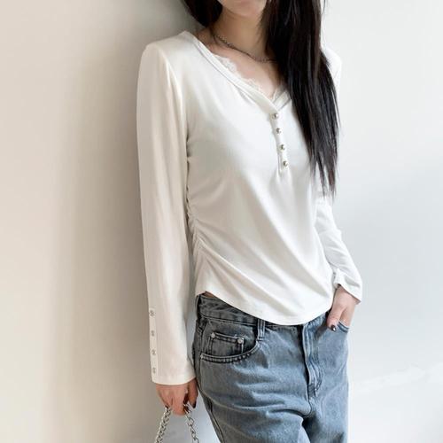 [옷자락]여자 레이스 스판 골지 헨리넥 소매버튼 긴팔티