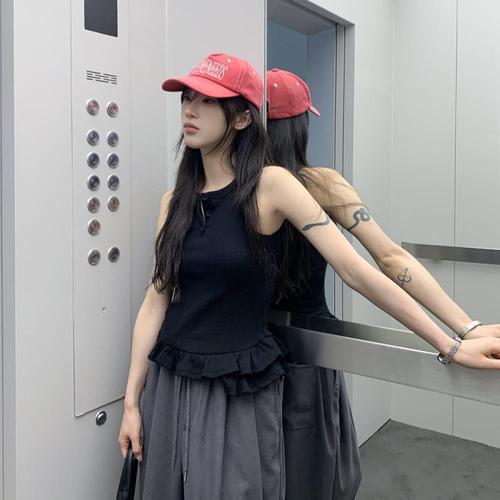 [다잇템]여자 단추 프릴 슬리브리스 티어드 골지 티셔츠
