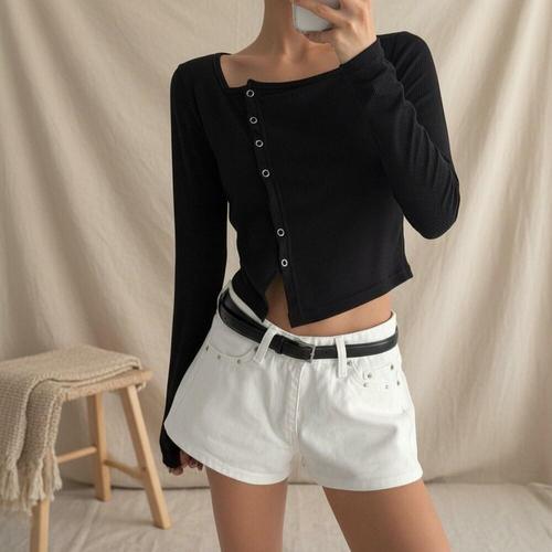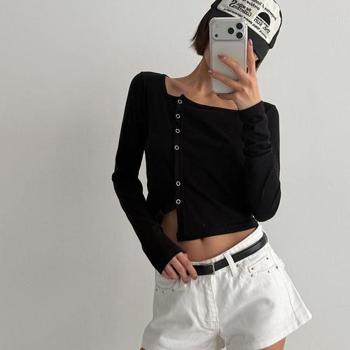 [옷자락]여성 봄긴팔 크롭 스퀘어넥 언발버튼 잔골지 티셔츠