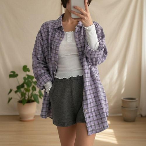 엘리몬드 벌룬 소매 루즈핏 라운드 단추 포인트 체크 블라우스 여성상의 차르르 봄옷 가을옷 패