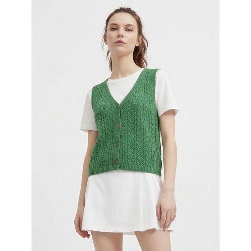 [샵앤]국산 여성 Y단추 오픈 꽈배기 뜨개 펀칭 니트 조끼 BOM-WVS-21208-그린