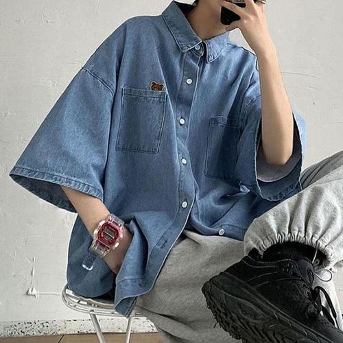 [에이치플러스몰]남성 베어 포켓 데님 반팔 셔츠 여름 캐주얼 청남방