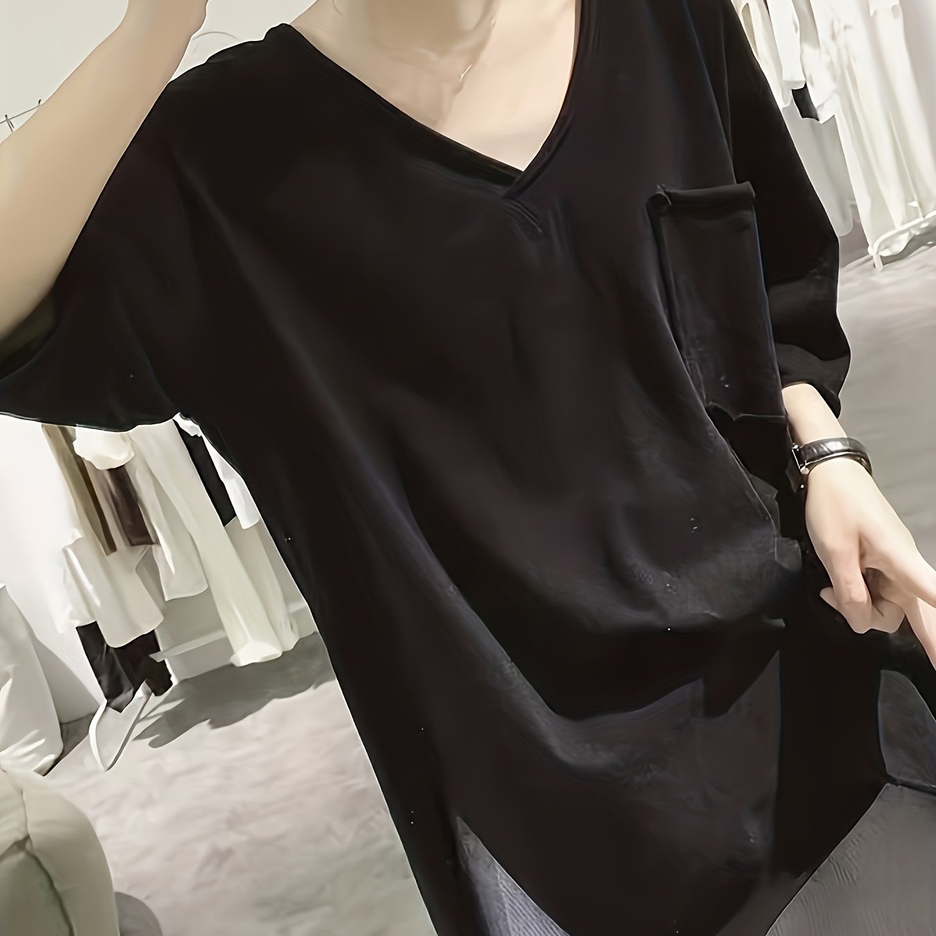TEMU 슬릿 티셔츠 여성 여름 루즈핏 한국 롤링 엣지 앞면 숏 백 롱 반팔 V넥 탑