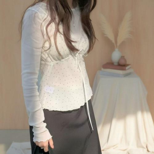 [다잇템]여성 땡땡이 레이스 캡내장 슬림핏 끈나시