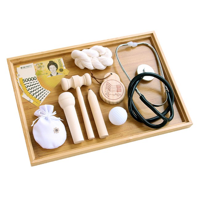 전통 돌잡이 8종 세트 (직사각 트레이 포함)-청진기 판사봉 엽전 실타래 붓 바늘꽂이